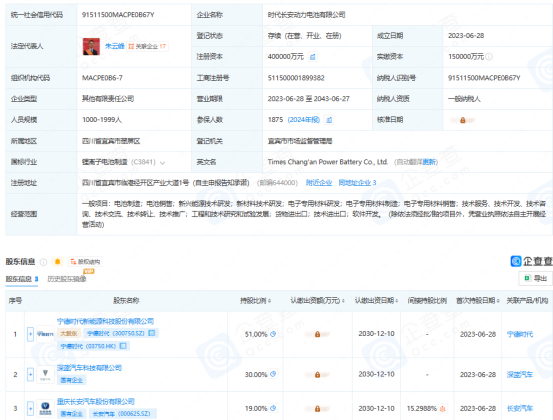 公开资料显示,持股公司时代长安成立于2023年6月,由宁德时代新能源科技股份有限公司(简称:宁德时代)、深蓝汽车科技有限公司、重庆长安汽车股份有限公司(简称:长安汽车)共同持股。