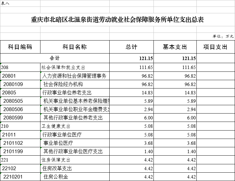 (二)支出预算:2022年年初预算数121.15万元,其中:社会保障和就业支出111.65万元,卫生健康支出5.08万元,住房保障支出4.42万元。