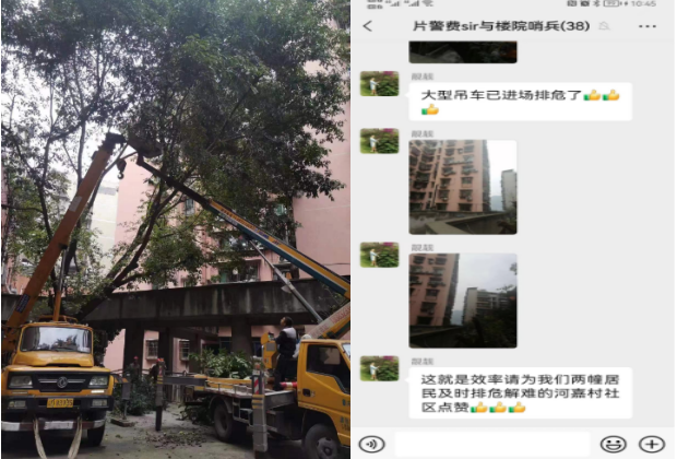 河嘉村社区及时清理被风吹断的断裂大树,消除了安全隐患,得到了居民群众的点赞。
