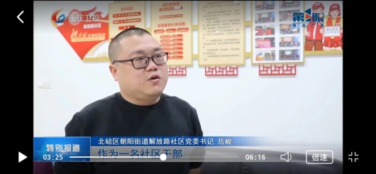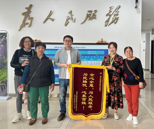 解放路吉林巷6号业主代表向朝阳街道赠送锦旗,感谢街道积极推进老旧小区加装电梯。