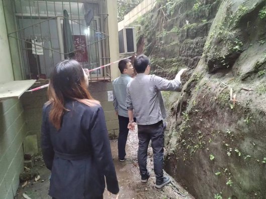 办事处副主任李蓓蓓带队查看辽宁路87号危房地基勘测情况,要求勘测队落实好现场安全措施。