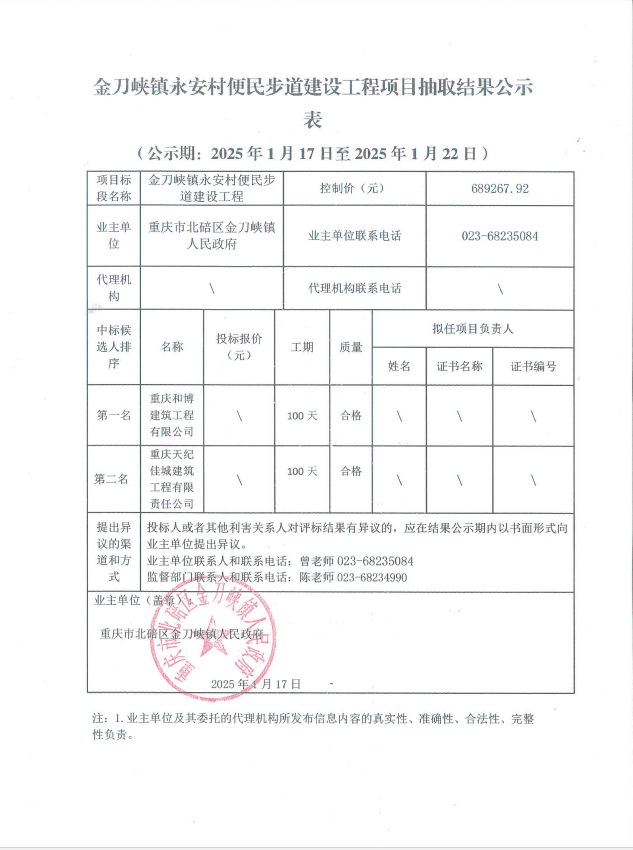 金刀峡镇永安村便民步道建设工程项目抽取结果公示