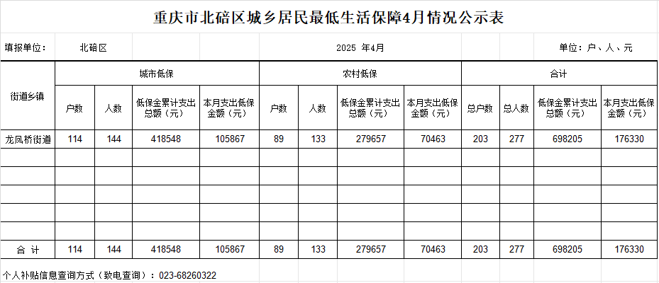 重庆市北碚区城乡居民最低生活保障4月情况公示表