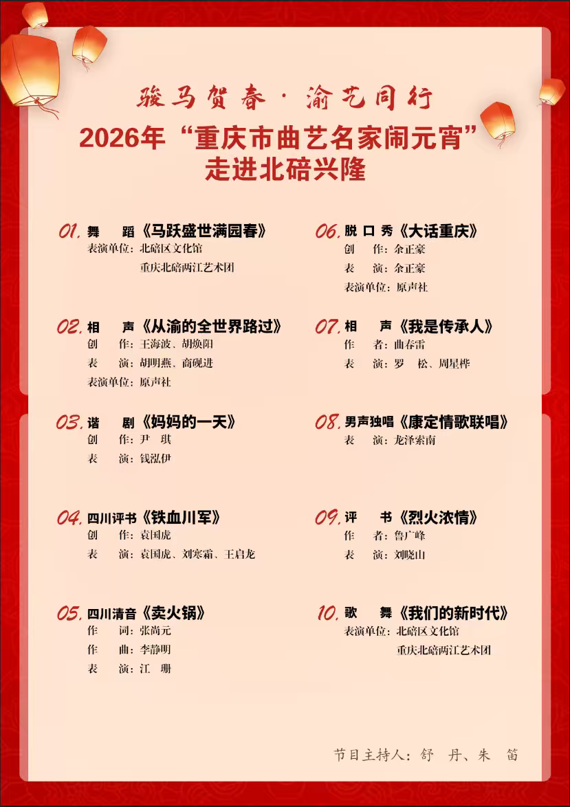 为深入学习贯彻党的二十届四中全会精神,弘扬中华优秀传统文化,推动文化繁荣、科技进步、健康中国建设,丰富广大群众马年春节期间精神文化生活,文化赋能川渝高竹新区建设,助推文旅融合,拟举办“骏马奔腾•春到万家”——2026“重庆市曲艺名家闹元宵”走进北碚兴隆镇。特制定活动方案如下: