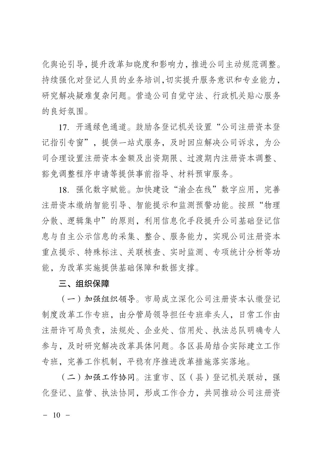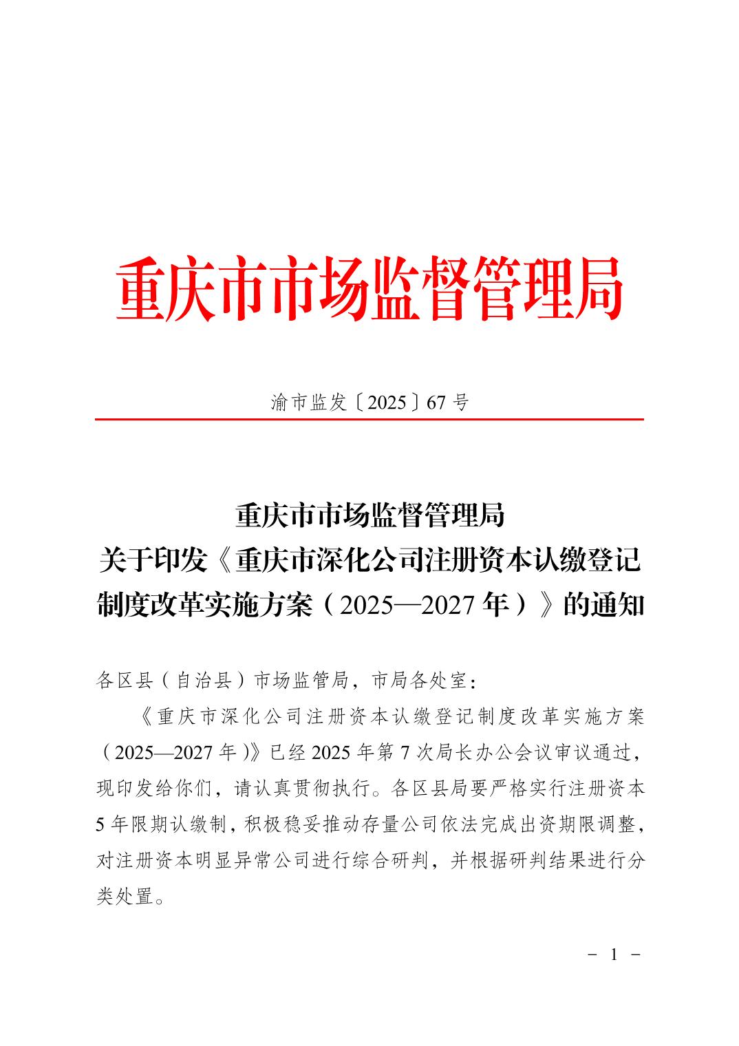 重庆市市场监督管理局关于印发《重庆市深化公司注册资本认缴登记制度改革实施方案(2025—2027年)》的通知