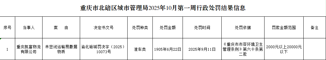 重庆市北碚区城市管理局2025年10月第一周行政处罚结果信息