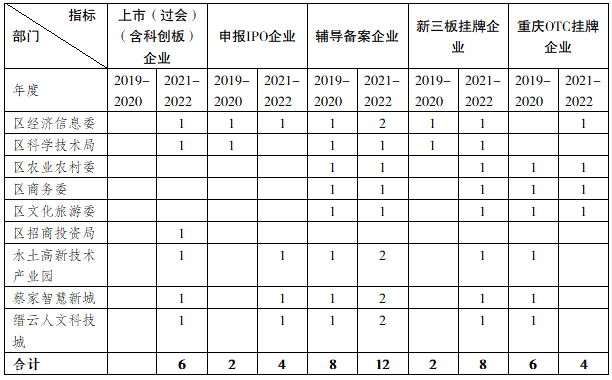 备注:2019-2022年,全区上市过会(含科创板)目标企业6家(区经济信息委1家,区科学技术局1家,区招商投资局1家,两江新区水土高新技术产业园1家,两江新区蔡家智慧新城1家、缙云人文科技城1家),申报IPO目标企业6家(区经济信息委2家,区科技局1家,两江新区水土高新技术产业园1家,两江新区蔡家智慧新城1家、缙云人文科技城1家),辅导备案目标企业20家(区经济信息委3家,区科学技术局2家,区农业农村委2家,区商务委2家,区文化旅游委2家,两江新区水土高新技术产业园3家,两江新区蔡家智慧新城3家、缙云人文科技城3家),新三板挂牌目标企业10家(区经济信息委2家,区科学技术局2家,区农业农村委1家,区商务委1家,区文化旅游委1家,两江新区水土高新技术产业园1家,两江新区蔡家智慧新城1家、缙云人文科技城1家),重庆OTC挂牌企业10家(区经济信息委1家,区农业农村委2家,区商务委2家,区文化旅游委2家、两江新区水土高新技术产业园1家,两江新区蔡家智慧新城1家、缙云人文科技城1家)。