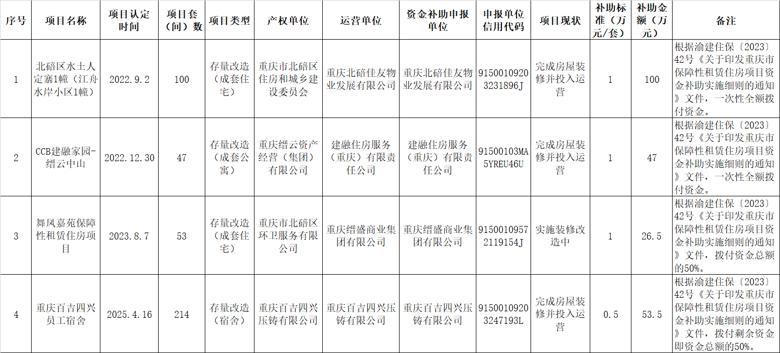 根据《重庆市住房和城乡建设委员会 重庆市财政局关于印发重庆市保障性租赁住房项目资金补助实施细则的通知》(渝建住保〔2023〕42号)文件规定,现将本次申请保障性租赁住房资金补助项目情况予以公示。