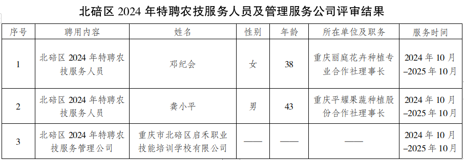 北碚区2024年特聘农技服务人员及管理服务公司评审结果
