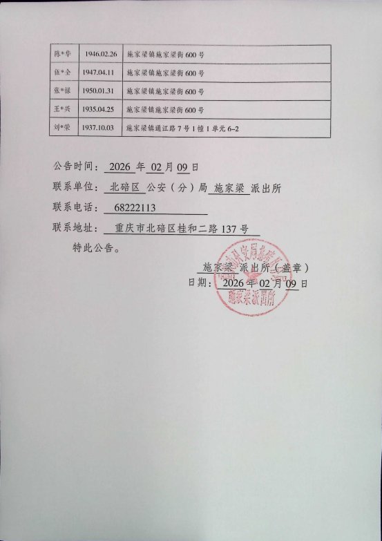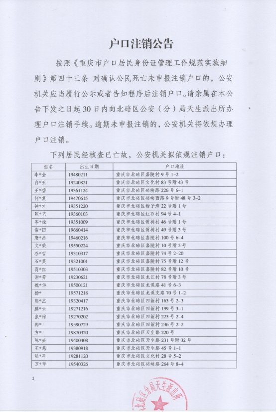 按照《重庆市户口居民身份证管理工作规范实施细则》第四十三条 对确认公民死亡未申报注销户口的,公安机关应当履行公示或者告知程序后注销户口。经核实,以下居民已亡故,公安机关拟依规注销户口,现予以公告:
