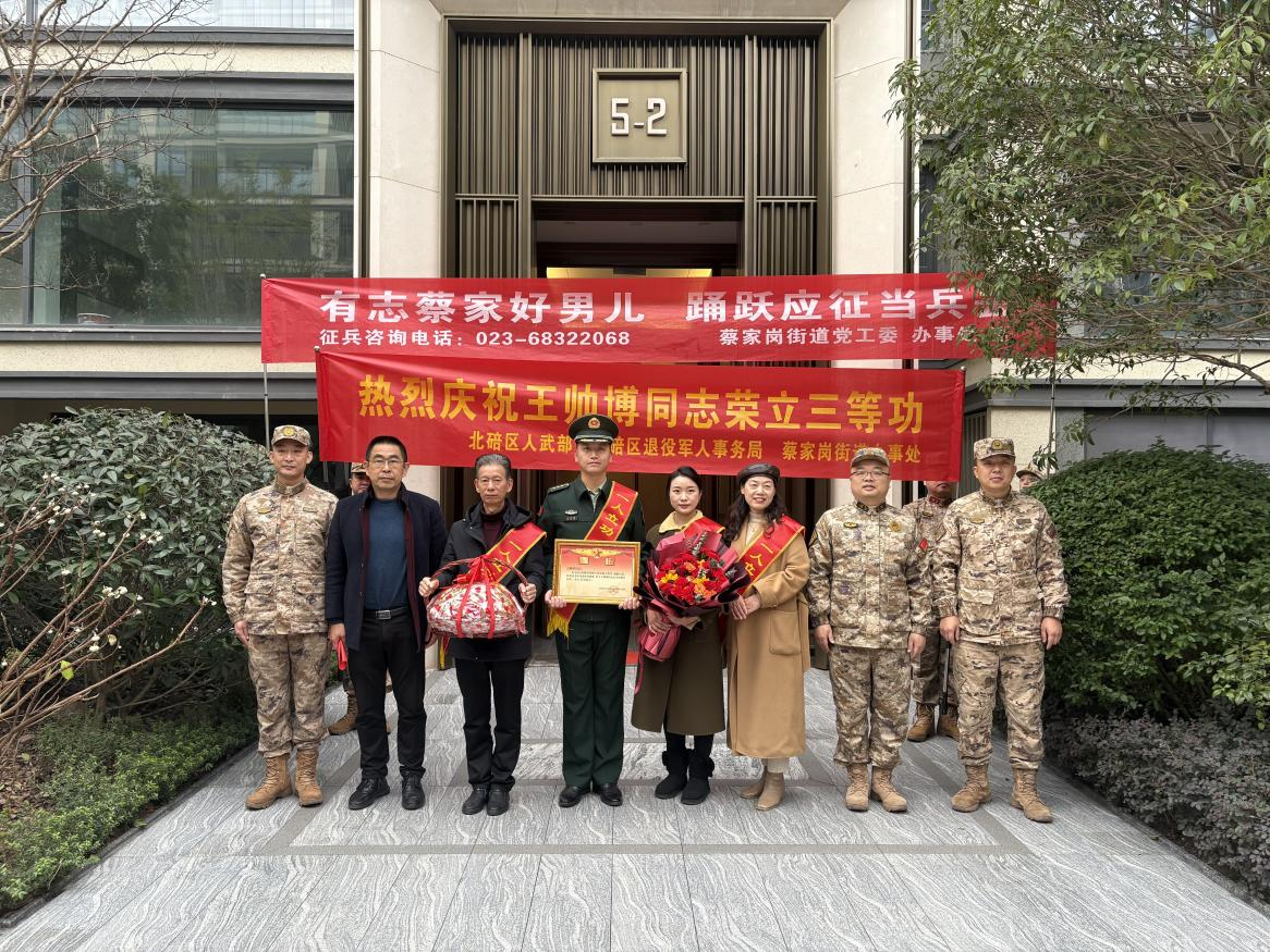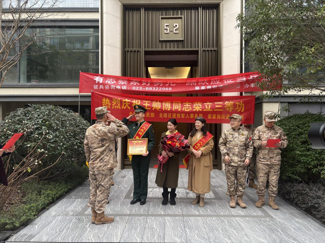为进一步弘扬良好拥军优属拥政爱民优良传统,在新春来临之际,2025年1月22日,北碚区退役军人事务局联合北碚区人武部、蔡家岗街道、武警重庆总队机动支队开展了庄重热烈的送喜报活动,前往荣立三等功现役军人王帅博的家中,为家属送上喜报和慰问品,并致以诚挚的祝福。